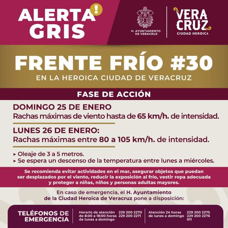 25 de enero de 2026 La Dirección de Protección Civil Municipal de Veracruz informa que continúa la Alerta Gris ante el Frente Frío No. 30, que afectará la ciudad desde este domingo, con descenso de temperatura y ambiente fresco a…