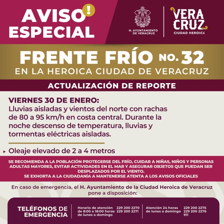 30 de enero de 2026 Con pronóstico de lluvias aisladas y vientos del norte con rachas de 80 a 95 km/h, el Frente Frío No. 32 ingresará a las costas de la ciudad de Veracruz la noche de este viernes,…
