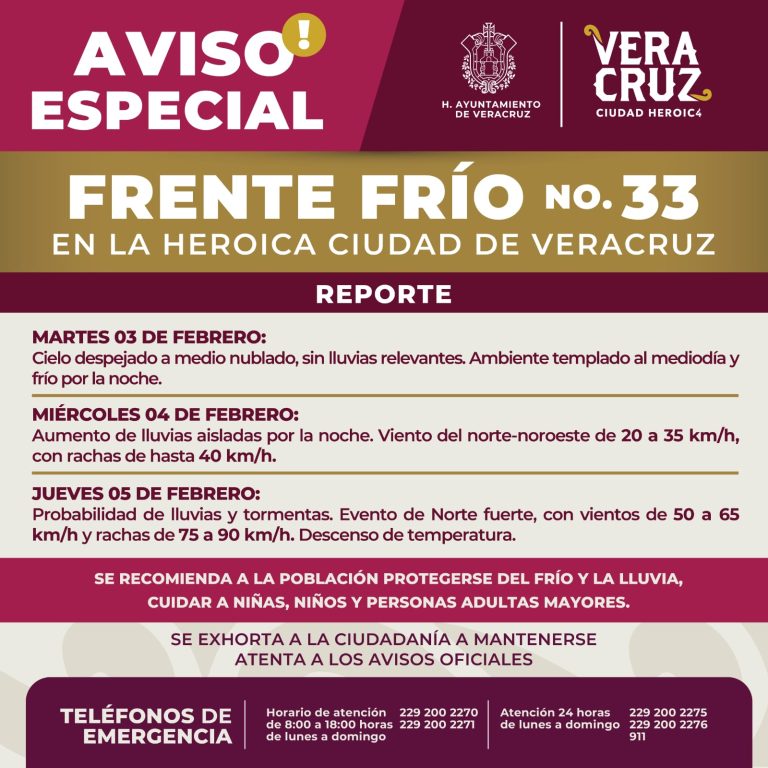 04 de febrero de 2026 Ante la cercanía del Frente Frío 33 que se espera ingrese en las próximas 24 horas, la dirección de Protección Civil municipal mantiene el Aviso Especial para la ciudad de Veracruz, previendo para este miércoles…